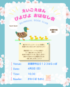 バイリンガル絵本クラブ バイリンガル絵本クラブ@武蔵野市立 0123はらっぱ(主催:かわくぼ ちさと) 「おうちで英語を始めたいけれど、何から始めたら良いかな」とお悩みのママ・パパ、英語絵本がおすすめです✨ 0〜3歳の赤ちゃんへの読み聞かせにおすすめの英語絵本をご紹介します!一緒に楽しみましょう💕 🟡日時:4月5日(日) 10:30-10:50 🟡場所:武蔵野市立0123はらっぱ 🟡参加費:無料 🟡対象:0〜3歳のお子さんとその親御さん 🟡申し込み方法:事前のお申し込みは不要です。直接はらっぱへお越しください 🟡読み手:かわくぼ ちさと instagram note
